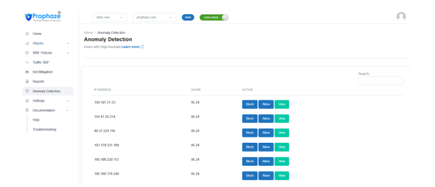 Within this section, the platform highlights anomalous requests directed towards the application. Prophaze leverages AI/ML technology to analyze and profile the application during a learning mode phase, subsequently formulating application-specific rules in the backend. This process assigns a threat score value to the application, with any request surpassing this threshold automatically blocked for a duration of 48 hours.