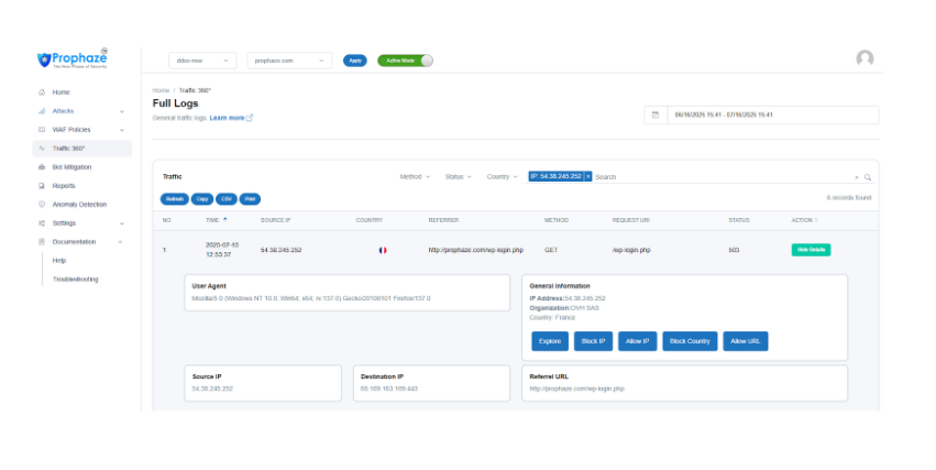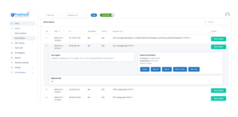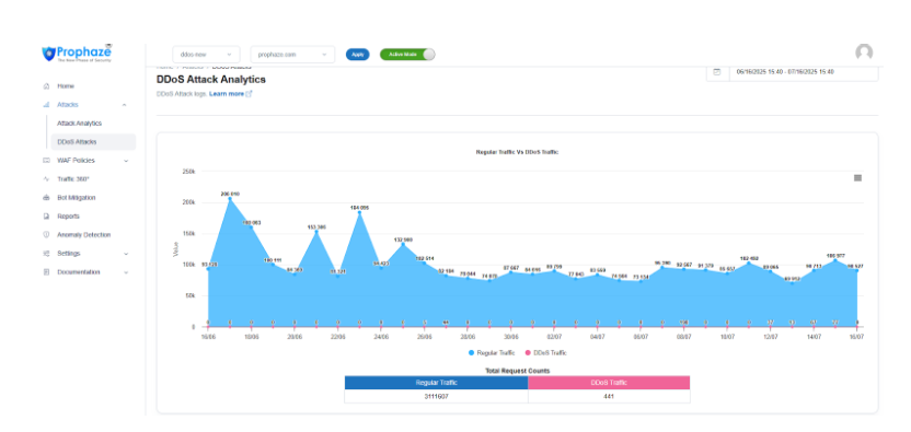 Traffic Request Counts:  In addition to the graph, Prophaze provides a comparison of the total count for both regular traffic requests and DDoS traffic requests. This numerical data complements the visual representation in the graph and offers a more precise understanding of the attack volume.