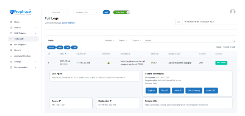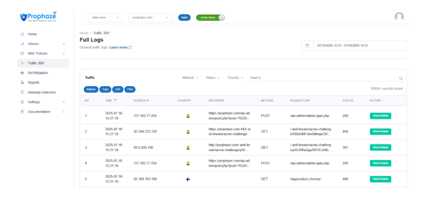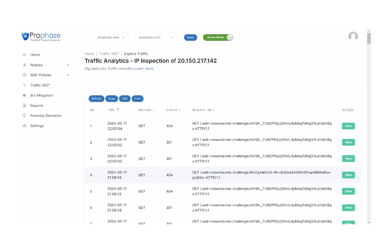 The Traffic Analyzer provides immediate visibility into recent server requests. It offers various filters to conduct targeted analysis based on specific parameters, facilitating focused investigation and insights.